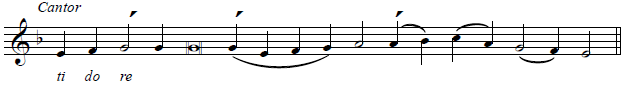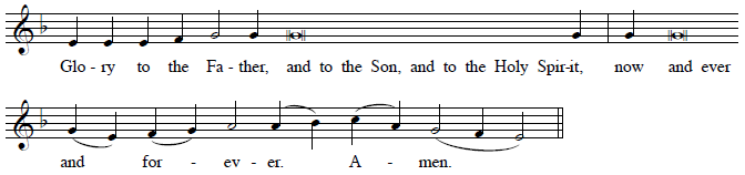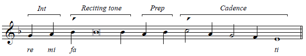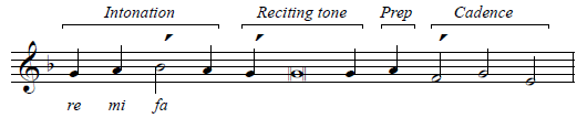 All four phrases of this melody have the same basic components: an intonation which begins the phrase; a reciting tone which is used to sing a variable amount of text; a preparatory note to signal the approach of the cadence; and the cadence itself which ends the phrase.
