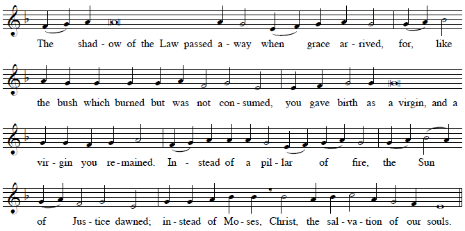 The last sticheron at the Lamplighting Psalms on an ordinary Saturday evening is called a dogmatikon, because it highlights the dogma or teaching of the Incarnation. Here is the tone 2 dogmatikon, set to the Tone 2 samohlasen melody. The verse is given, followed by the sticheron. Notice how each phrase flows into the next.
