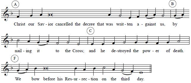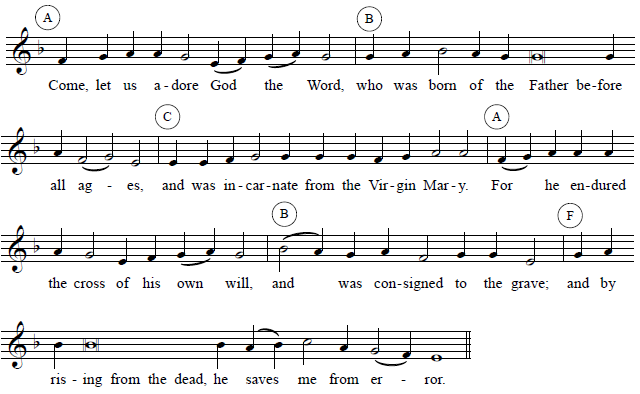 The melody consists of four parts, which we call A, B, C, and F (meaning final). For a longer sticheron, we repeat the A, B, and C phrases in order, as many times as necessary: