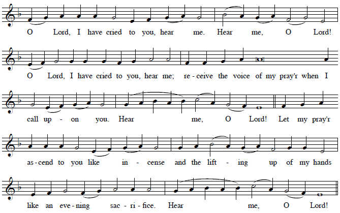 As the church is incensed and the lamps are lit, we sing the first two verses of Psalm 140 to the samohlasen sticheron melody in the Tone of the first sticheron; on Saturday evening, this will almost always be in the Tone of the Week. Here is how these verses are sung in Tone 2.