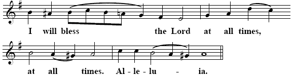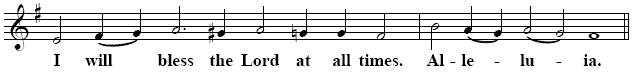 Be careful of the melodic leap upward, from the end of the second phrase ("at all times") to the start of the Alleluia. The melody here is JUST similar enough to the Tone 3 and 4 prokeimenon melodies that it is tempting to go up only one step rather than two for the first syllable of "Alleluia".