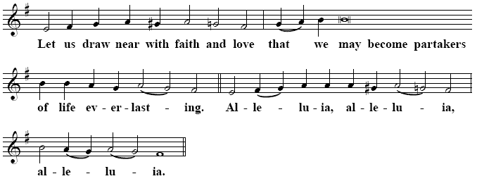 Notice the same syncopated second Alleluia. The Communion Hymn should be sung like the second part of the Entrance Hymn - solemnly but not too slowly. It should not drag, but should reflect our joy at being admitted to the Lord's Supper.
