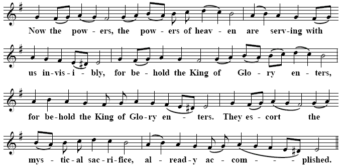 The melody here is shorter, and only sung twice; for this reason, even if it is sung in the same solemn fashion as the first, it may need to be repeated once or twice until the celebrant comes to the northern deacon's door and is ready to make the entrance procession.