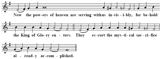 The entrance is made in SILENCE, while all kneel. When the celebrant enters the sanctuary, we stand to sing the second part of the hymn, which (like the second part of the Cherubic Hymn) looks forward to the distribution of this sacrifice to the faithful, in Holy Communion. Here is the first or A version of the second part: