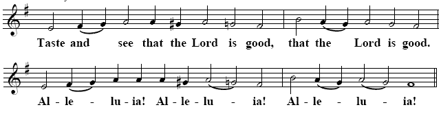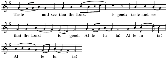 Those familiar with the older setting of this hymn will notice that the text has changed to match the text of Psalm 33 in the Grail translation ("Taste and see that the Lord is good" rather than "...how good the Lord is"), and the melodic setting has been adjusted accordingly.