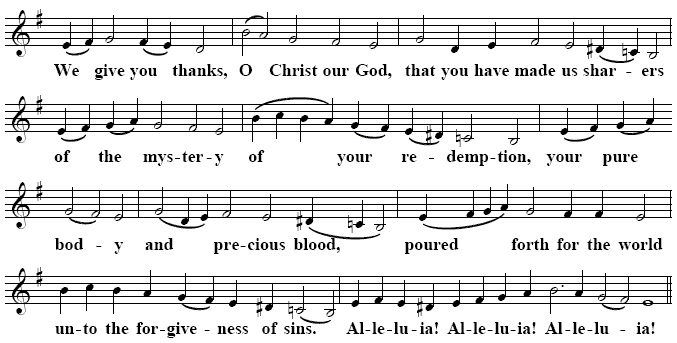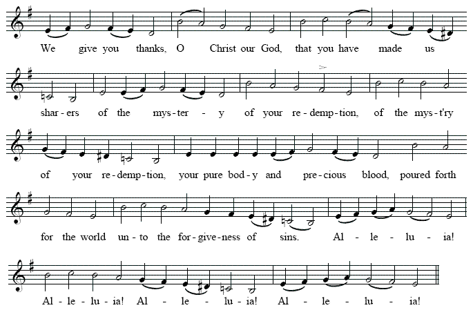 After Communion has been distributed, the celebrant does not bless the faithful with the chalice, but instead blesses God. The people respond, "Amen" in the Lenten tone, then sing a thanksgiving hymn which is unique to the Ruthenian recension of the Byzantine Rite. The original melody for this hymn, in the Slavonic, is very beautiful, and is probably the most challenging chant of the service. It is NOT, however, all that difficult to sing, once a single trouble spot is learned correctly. Here is this melody, the first or A setting of the hymn of thanksgiving: (listen)