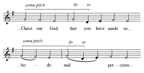 Notice that the pitch on "that" in the first line is the same pitch as "Christ", and then drops a perfect fourth. In the same way, "and" in the second line is the same pitch as the first note of "body", and then drops a fourth. (Listen to a MIDI recording of the notes at the trouble spot, then of the entire phrase.) You can also listen to a recording of the Church Slavonic setting of the same hymn.