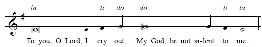 Sometimes a psalm verse falls into three or four parts. The portion that is not indented is sung on do; the part that is indented is all sung on re, up to the ti - do ending:
