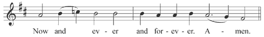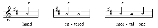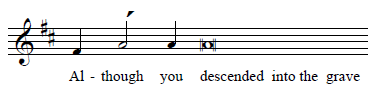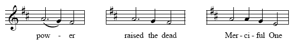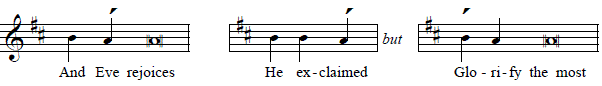 The intonation of the B phrase is used to sing one or two syllables before the first internal text accent. If there are three or more syllables before this accent, then the intonation is used to sing a single syllable, and the first syllable on the reciting tone is not accented. Be careful not to sing the first reciting tone note too strongly in this case.
