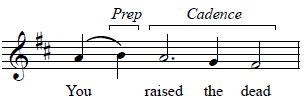 To signal the approach of the cadence, a preparatory note is used to sing the syllable before the cadence. The preparatory note is melodically weak; if the syllable before the cadence is accented, we slur to reciting tone and the preparatory note together.