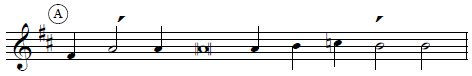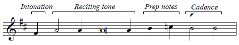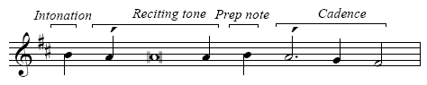 The A phrase melody consists of an intonation, a reciting tone, and a cadence with two preparatory notes:
