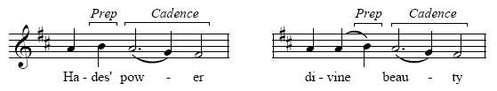 To signal the approach of the cadence, two preparatory notes are used. They are used to sing the two syllables before the cadence - or slurred together to sing the syllable immediately before the cadence, if it is accented: