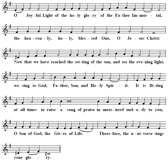 At the very end of the final sticheron, the clergy are ready to make a solemn entrance into the sanctuary. The deacon intones, "Wisdom! Be attentive!", and the cantors and faithful sing the ancient evening hymn, "O Joyful Light", while the sanctuary and faithful are incensed: (listen)