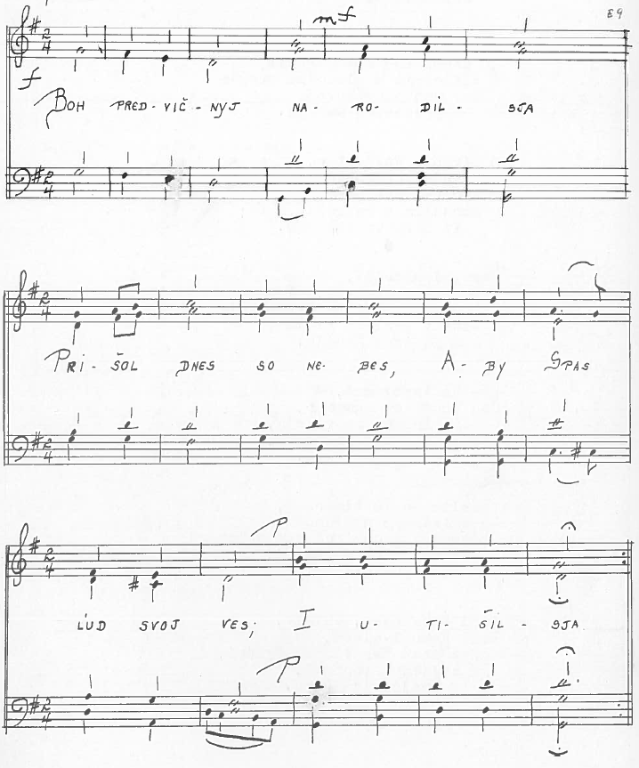 In 1969, Father Stefan Papp printed a version with music and five verses (Duchovňi Pisňi, page 141). The five verses all correspond to verses in the 1913 Uzhorod version, but with a significant number of textual changes (some of them common to the Ukrainian version given below)..