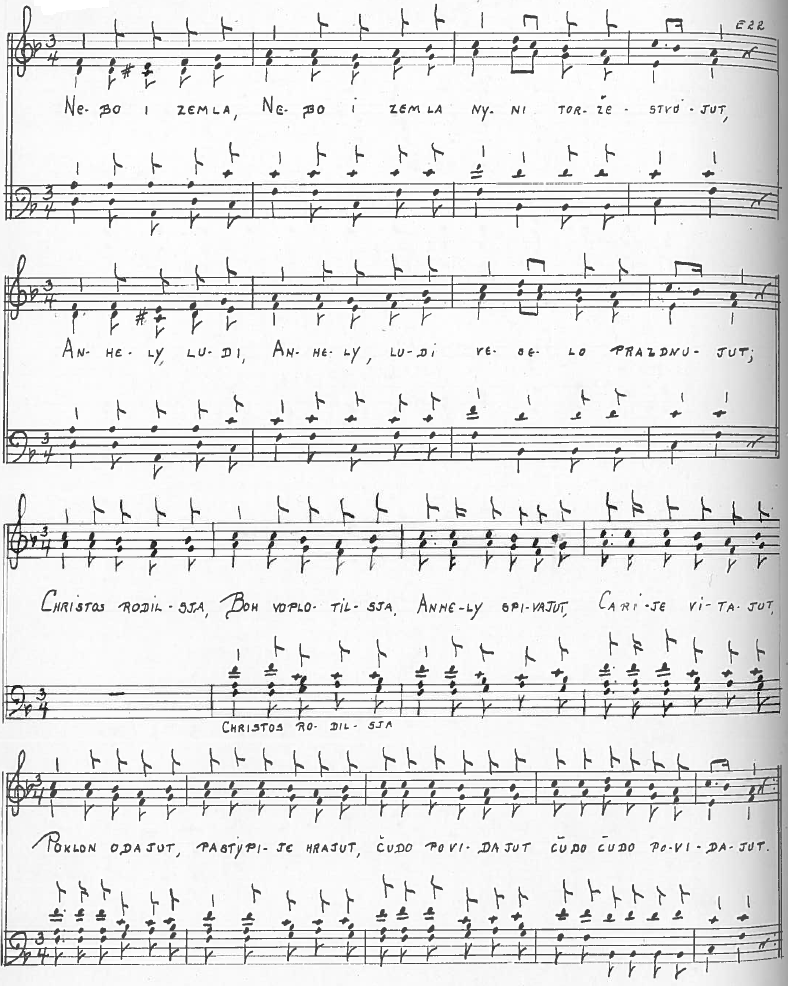 1. Nebo i zemľa (2) nyňi toržestvujut' - anhely ľudy (2) veselo prazdnujut': - Christos rodilsja - Boh voplotilsja - anhely spivajut - carie vitajut - pastyri ihrajut - poklon otdajut - čudo, čudo povidajut.