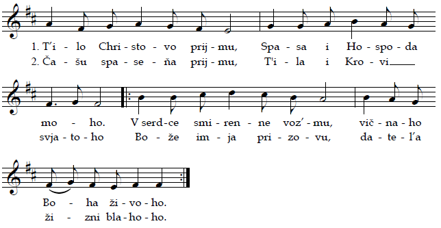Fr. William Levkulic provided the text (only) as the second paraliturgical hymn for Holy Communion hymn on page 150 of his The Divine Liturgy: A Book of Prayer (1978), along with an English translation, Give me your Body, O Christ. His text is the one used above; the second verse was not included in the Papp setting.