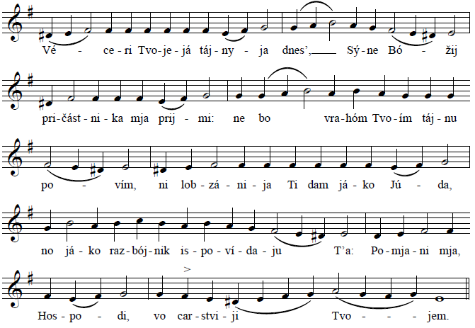 Note: there are some variations in the Slavonic text - in particular, in the last two phrases some versions add "vopiju" (crying out) and "when you come [in your kingdom]." Here we follow the text found on page 1210 of the Roman Časoslov (in the prayers before Holy Communion), which is slightly different from the version in some older chant books such as Bokshai.