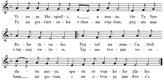 Note: According to the directives of our bishops, hymns which are not liturgical or Scriptural texts should not be sung during the Divine Liturgy (though they may be sung before or afterwards). This hymn is one of a SMALL number which may by exception be sung at Holy Communion, since it is versification of the liturgical pre-Communion prayer ("O Lord, I believe and profess..."). Therefore, it has been included as one of the hymns for Holy Communion at the back of the MCI booklet for Vespers with Divine Liturgy on Great and Holy Thursday. Consult your pastor before using.