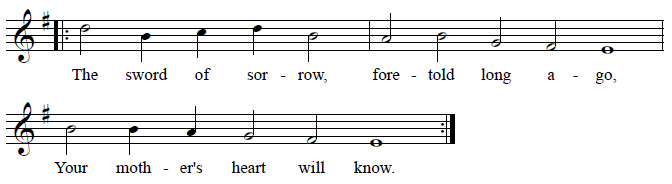 In Slavonic, this hymn is metrically regular; in other words, accents fall in the same place in each verse. But if we sing the hymn to the same rhythm, we get bad English accents: "The sword OF sor-ROW"; "Your mo-THER's".