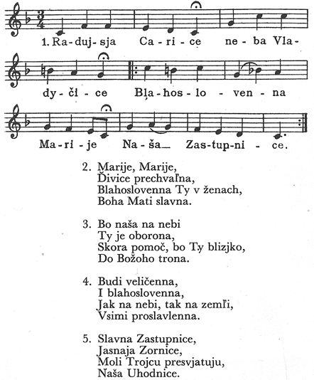 Radujsja Carice was omitted from the 2007 Byzantine Catholic Hymnal, because it was not in the 1978 Levkulic Divine Liturgies book (which the MCI was directed to use as the basis for that hymnal). Monsignor William Levkulic and cantor Jerry Jumba included Slavonic and English versions in their 1984 Marian Hymnal. Here is the English version: