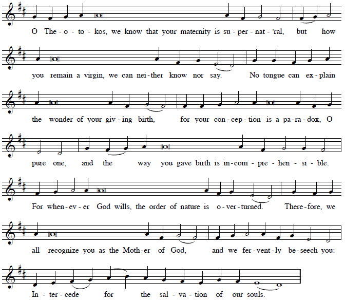 The last sticheron at the Lamplighting Psalms on an ordinary Saturday evening is called a dogmatikon, because it highlights the dogma or teaching of the Incarnation. Here is the tone 7 dogmatikon, set to the Tone 7 samohlasen melody. The verse is given, followed by the sticheron. Notice how each phrase flows into the next.
