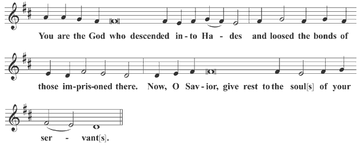 Then the priest intones the prayer, "O God of spirits and of all flesh...." This is our most ancient prayer for the dead; a version of it is found in the 8th century Barberini Codex, our first collection of Byzantine priestly prayers. At the end of the prayer, we sing the minor-key "Amen", but this time adding a D# as a sort of grace note:
