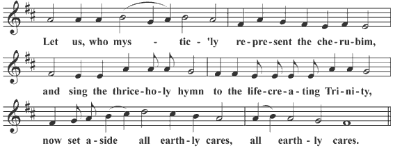 - The first part of the hymn ("Let us who mystically..." through "... all earthly cares.") is ordinarily sung three or four times, to allow time for the priest and deacon to incense the gifts, pray at the altar, and begin the procession.