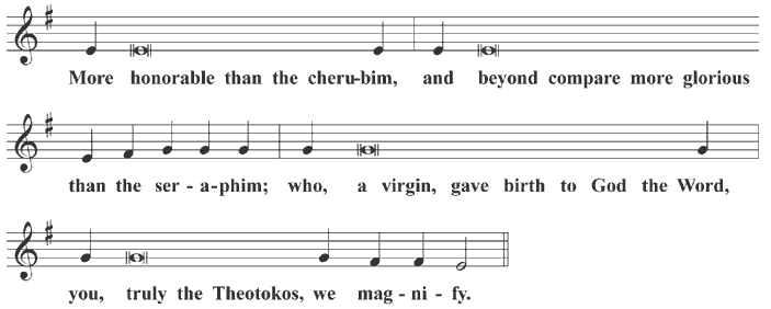 When the deacon intones, "Wisdom", we sing "More honorable than the Cherubim", to the same minor psalm tone (la - ti - do; do - ti - la) that we used for the beginning prayers: