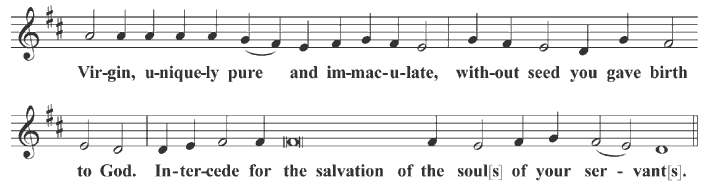 (By the way, this last hymn is also called a theotokion - a hymn to the Mother of God, the Theotokos. Very frequently, the last hymn of a set is directed to Mary, the Mother of our Lord.) Note that YOU are responsible for correctly singing "soul(s)", "servant(s)", and "him / her / them", depending on whom everyone present is praying for in this Panachida.